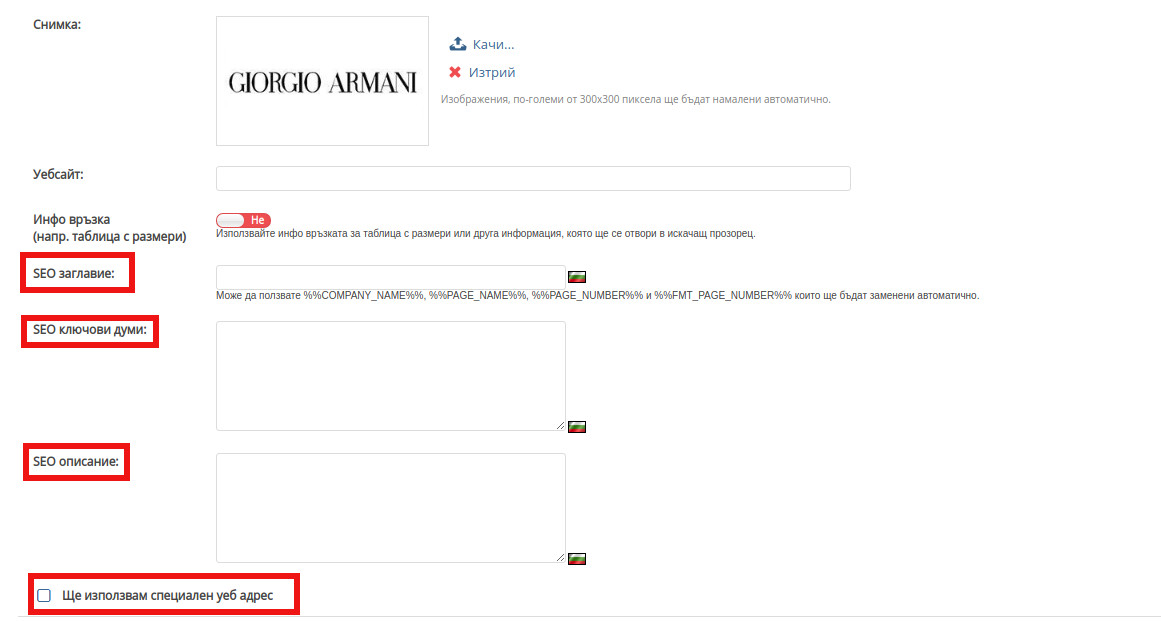 27. Функционалността за SEO описания е част от настройките за всяка въведена от вас Марка. Това прави уникализирането на всяка Марка лесно и удобно.