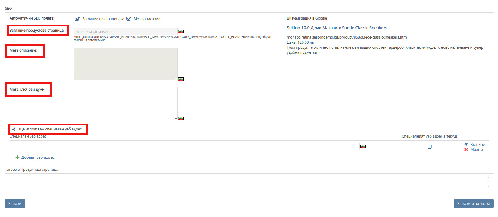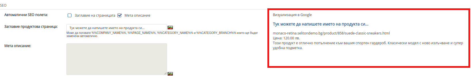 16. Платформа Seliton има и вече създадено поле за Meta Description (Мета описание) в продуктова страница. Настройката може да бъде с автоматично попълване, както и с избрано от вас съдържание.
