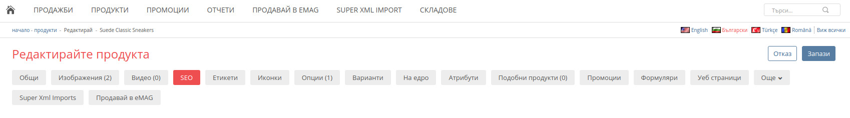 14. Във всеки един продукт имате таб SEO, който ви позволява да направите желаните настройки дори на ниво продуктова страница.
