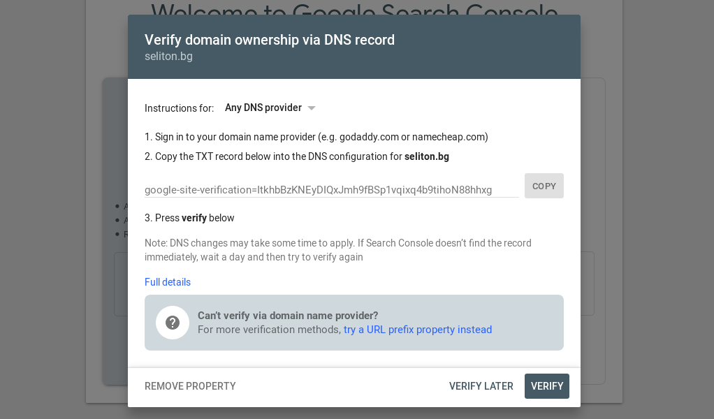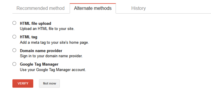 След като сте добавили “собствеността си” е време да докажете, че тя е “Ваша”. Можете да направите това по няколко начина, тъй като имате избор от няколко опции за верификация в зависимост дали сте работили с HTML или не сте: