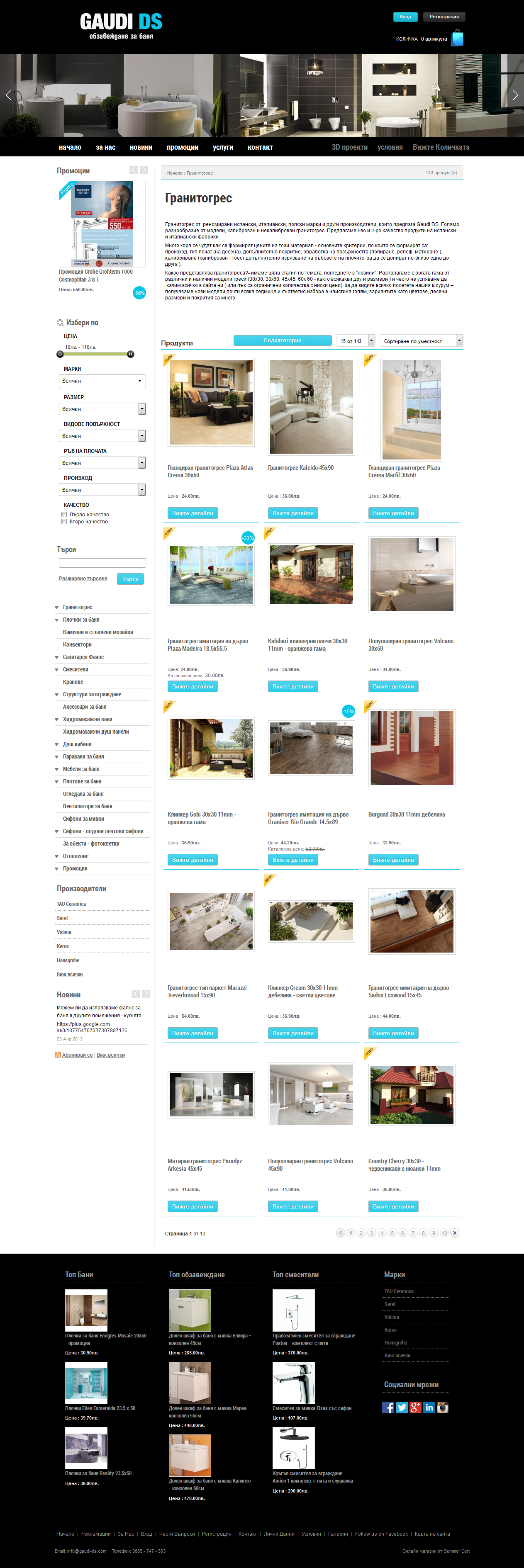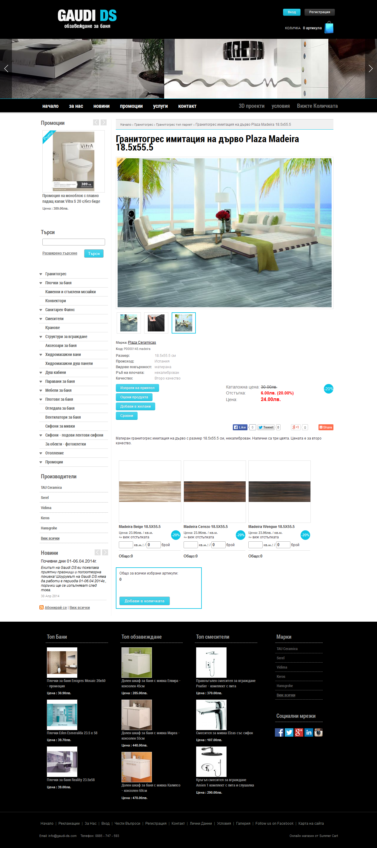 Днес ще ви представим Gaudi-DS – обзавеждане за баня. Това е може би най-успешния ни клиент в този бранш, ползващ платфората Summer Cart, за да представи своя бизнес в интернет пространството. Фирмата се занимава с внос и дистрибуция на отопление и продукти за банята – плочки, фаянс, мебели за баня, конвектори. Благодарение на богатия си и качествен асортимент е извоювала своето място на пазара. С добрата си работа и внимание към всеки детайл, техния екип е превърнал сайта gaudi-ds.com в място, където всеки клиент може да намери всичко за банята, от което има нужда. Информацията е добре поднесена, идеята е човек да добие добра представа за продуктите и да е добре осведомен – може би това е и най-верния път към успешната продажба. Дизайнът на Gaudi-DS е добре издържан, стилен и разбира се - изключително функционален. Тук е момента и да отбележим, че сайтът е на версия 6.0 на Summer Cart и изглежда по абсолютно същия начин ( със съществени подобрения ), както сайта на фирмата от 2011 година, когато Gaudi-DS бяха на платформа 4.0 на Summer Cart. По отношение на функционалностите, онлайн магазинът е изключително удобен за своите клиенти, сайтът предоставя най-разнообразни улеснения и опции – възможност за бърз преглед на продукти, прогнозна цена за доставка, различни разплащателни методи, огромни възможности за филтриране, както и много, много други. Тук е моментът и да споменем, че това не е просто онлайн магазин за баня, Gaudi-DS е фирма, разполагаща с шоурум, където нейните клиенти могат да видят на живо по-голямата част от предлаганите продукти за баня. Идеята е, че Summer Cart е много добра платформа за корпоративен сайт за търговия, а пък в същото време е и един превъзходен онлайн магазин. Ако решите да пазарувате от този магазин ще се натъкнете на над 1500 продукти за банята и отоплението, ще намерите лесно желаните от вас артикули, а пък и ще получите отстъпка за тях – под формата на намаление от цената или пък безплатна доставка. Отделно в сайта има специална секция „промоции“, с намалени продукти до – 40%, артикулите там се обновяват ежемесечно. Сайтът е много лесен за работа и е ориентиран в помощ на клиента - само след няколко кликвания на мишката, вие ще изберете желания от вас конвектор или пък смесител и ще може сами лесно да изберете мястото на доставка ( на място в магазина на Gaudi-DS или пък с куриерите Спиди, Еконт и Ин Тайм на ваш адрес ), както и разплащатеният метод – с електронно пос устройство, наложен платеж или пък по банков път. Желаем ви приятно пазаруване!