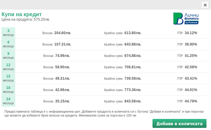 Модулът за пазаруване на изплащане разполага с вграден калкулатор, с чиято помощ клиентите Ви бързо и лесно, ще видят в отделен прозорец размера на вноските според стойността на продукта и избрания период за плащане. Модула на ПБ Лични финанси е максимално улеснен както за клиентите, така и за търговците използващи Seliton.